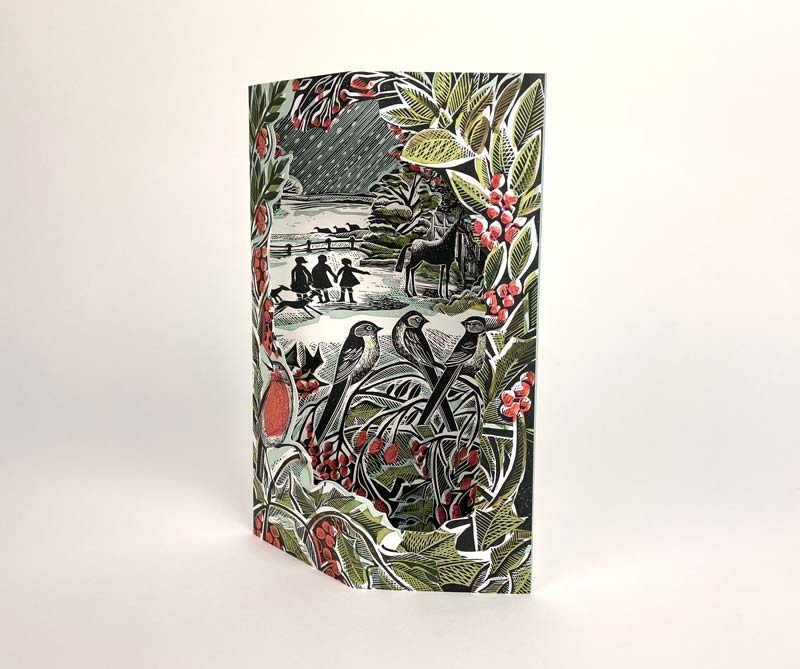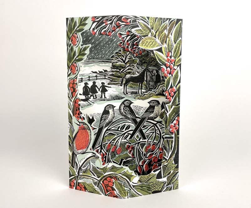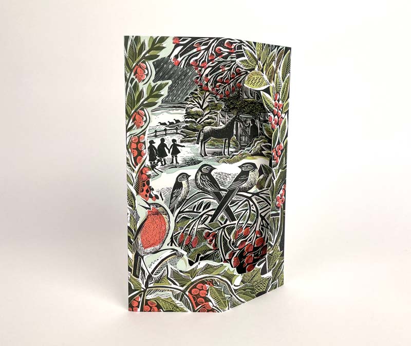 Holly Hedge & Home is a die-cut card that pops up to a 3-D scene featuring a wonderful lino and silkscreen print by Angela Harding.